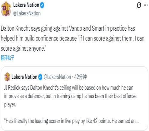 赛后雷迪克证实此事,他表示,训练营期间,克内克特打出了湖人所有球员中的最佳进攻表现。球队有数据追踪,在实战对抗中,他的得分比任何其他队友都高出42分,且投篮命中率在60%左右。但雷迪克也表示,克内克特的上限将取决于他的防守。