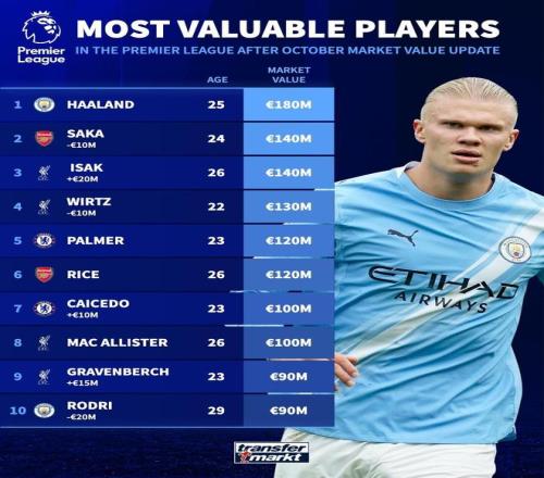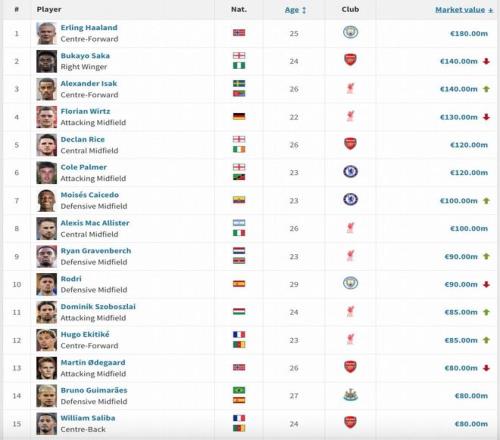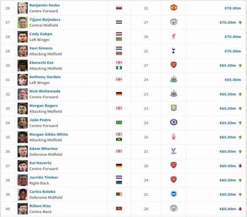 英超身价变更:维尔茨降至1.3亿欧,萨卡降至1.4亿欧,凯塞多升至1亿欧