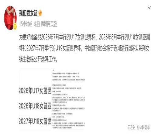 在接下来一两年内,U系列青年队有不少国家队大赛,像2026年7月份开打的U17世青赛,同年还有U18亚青赛。而2027年7月份,则还有U19世青赛。目前,这三项赛事的主教练人选还没有确定,和以往篮协直接任命不同,这一次,中国篮协也开窍了,他们已经正式宣布,这一次女篮主帅人选,将通过公开选拔,择优录取。换句话说,只要有能力,你就可以来尝试。