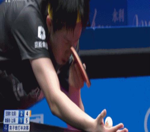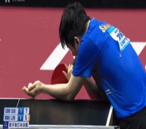 但是王楚钦在发球环节给樊振东极大压力——1比3,王楚钦发了一个台角保护的半出台,樊振东一吊,被早等在位置的王楚钦一个倒地爆冲。