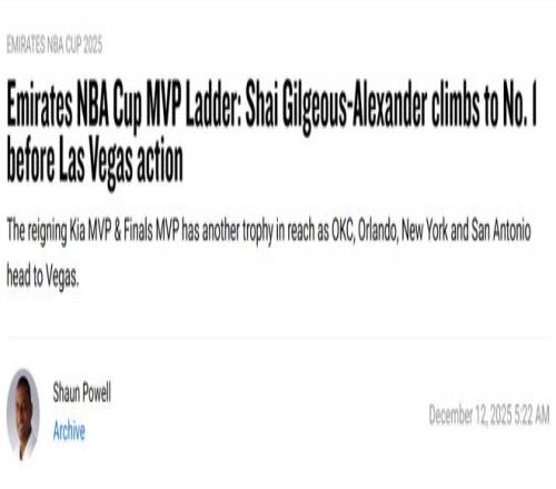北京时间12月13日,随着NBA杯四强的产生,NBA官网也更新了杯赛MVP的排行榜。雷霆球星亚历山大升至第一,尼克斯球星布伦森排名第二。上期排名第一的东契奇,由于湖人已经被淘汰,他的排名也跌至第七。以下是具体排名——