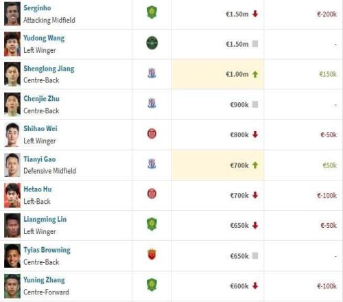至于国足昔日头牌武磊,因为本赛季中超基本都在养伤,最新身价已经跌至50万欧元,已经跌出了中国球员身价前10名。而韦世豪身价也小幅下跌,最新身价为80万欧元。