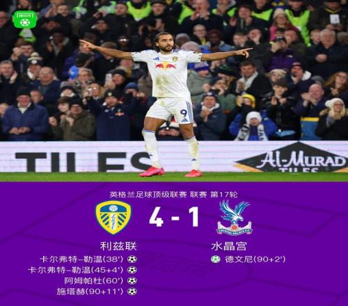 北京时间12月21日,英格兰足球顶级联赛第17轮,利兹联坐镇主场迎战水晶宫。比赛中,卡尔弗特-勒温率先破门,为利兹联取得领先。随后比约尔送出助攻,卡尔弗特-勒温再入一球,完成个人梅开二度。易边再战,阿姆帕杜接队友配合后攻入一球,进一步扩大比分优势。水晶宫由德文尼通过点球扳回一分。比赛最后阶段,施塔赫抓住机会再下一城,锁定胜局。最终全场比赛结束,利兹联以4比1战胜水晶宫。