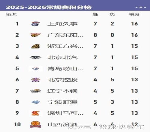 CBA积分榜最新排名出炉!上海逆袭广东冲上第1:辽宁第7山西第10