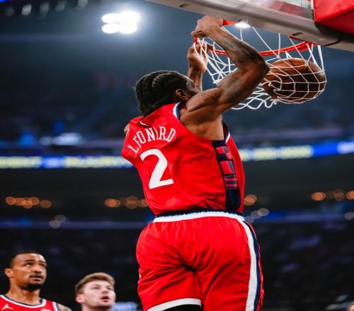 快船队首发阵容:哈登、邓恩、莱纳德、科林斯、大洛