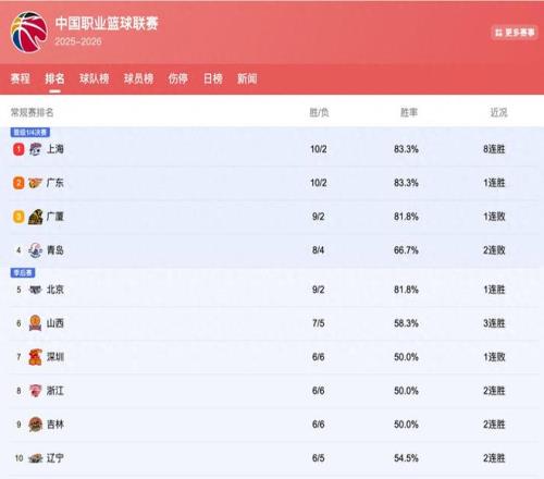 首先可以看一下前三的球队,分别是上海队、广东队以及广厦队。这三个球队最近的表现非常的火热。接下来如果说能够把这个成绩稳定下去,本赛季极有可能能够成为争冠的三强球队。其中我们可以看到,广东男篮虽然说目前是排在第二名,但是本赛季他们的目标其实是冲击榜首,争夺冠军。